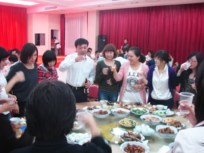 At the evening of 8 October 2011,an exciting evening party, jointly organized by Jiangsu Haihong Construction Engineering Co. Ltd. and Jiangsu Haixin Shipping Heavy Industry Co., Ltd. were held in the meeting room on the 10th floor of the office building. Slogan on the LED screen in the hall ,"pay tribute to all employees fighting on the frontline", was particularly noticeable. At six o'clock, the party began. Making us happier, the company invited a professional performing group for entertainment. With the wonderful performances and cheers of the crowds, Chairman Meng and his wife toast to the employees perennial working on the first-line table by table. During the party, two company's staffs shared with each other and looked like a big happy family.