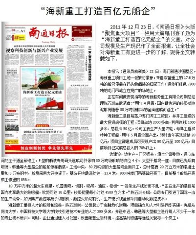 [船舶] 海新重工900噸龍門吊安裝結(jié)束 2月1日,記者在海新重工看到,一座900噸龍門吊已經(jīng)安裝結(jié)束,主體工程5月全面投產(chǎn)。 海新重工是南通市在建的單體規(guī)模最大的項(xiàng)目,總投資50億元...