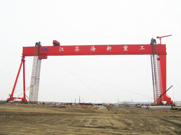 江蘇海新船務(wù)重工有限公司900T龍門吊經(jīng)過23天的提升,,于2012年1月9日順利提升到位。龍門吊總高為112米(含維修小車),主梁下高度為80米。預(yù)計(jì)1月15號(hào)左右鋼腿與主梁焊接完成,春...
